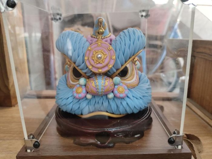 圖為精致繩編作品(獅頭造型),置于透明展盒中,藍(lán)、粉、金三色交融,詮釋非遺技藝與藝術(shù)創(chuàng)意的碰撞