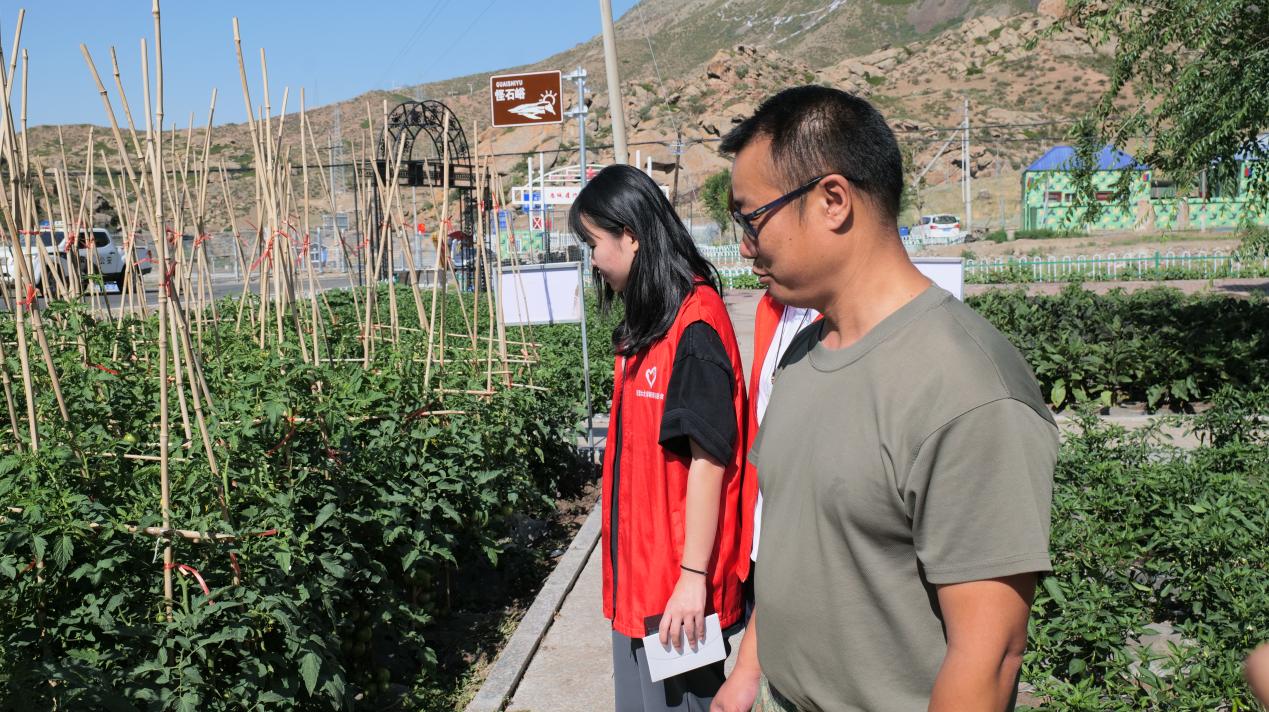 圖為實踐團(tuán)成員在八十一團(tuán)塔拉夏溝邊境警務(wù)站欣賞小菜園 (攝/張世航)