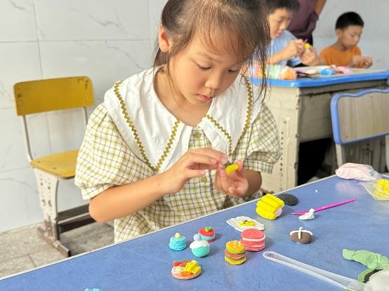 “美味拉面”主題則將課程推向高潮。孩子們化身“小廚師”,用超輕黏土開啟了一場充滿煙火氣的藝術(shù)創(chuàng)作。他們用黃色黏土拉出細(xì)長或卷曲的“面條”,手指靈活地搓、捏、刻,在“面條”上刻出或深或淺的紋理;制作配菜時(shí),紅色黏土被搓成圓溜溜的“肉丸”,綠色黏土搓成細(xì)長的“蔥花”,甚至有人悄悄在碗里藏了顆愛心煎蛋。支教老師發(fā)現(xiàn),這些日常食物的創(chuàng)作過程,悄然彌補(bǔ)著孩子們對(duì)城市生活的認(rèn)知空白。這讓團(tuán)隊(duì)更加堅(jiān)定:美育不僅是技能傳授,更是打開世界的窗戶。