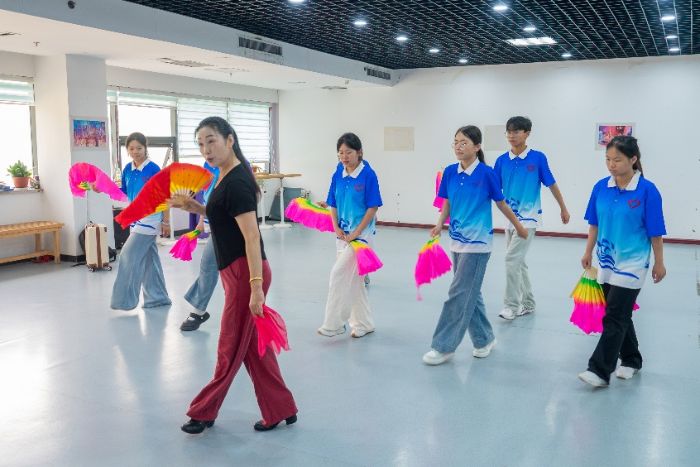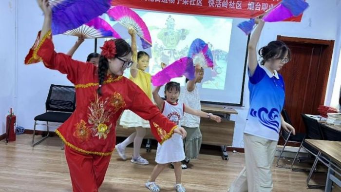 圖為實(shí)踐團(tuán)成員教小朋友秧歌,培養(yǎng)小朋友的興趣,積極傳播海陽(yáng)大秧歌傳統(tǒng)文化。張博斌 供圖