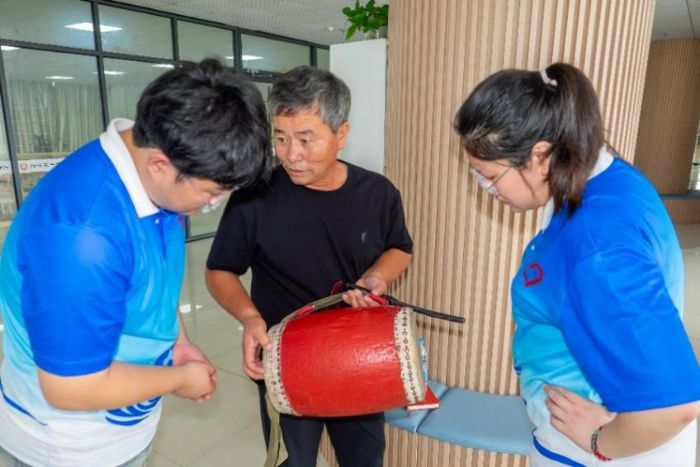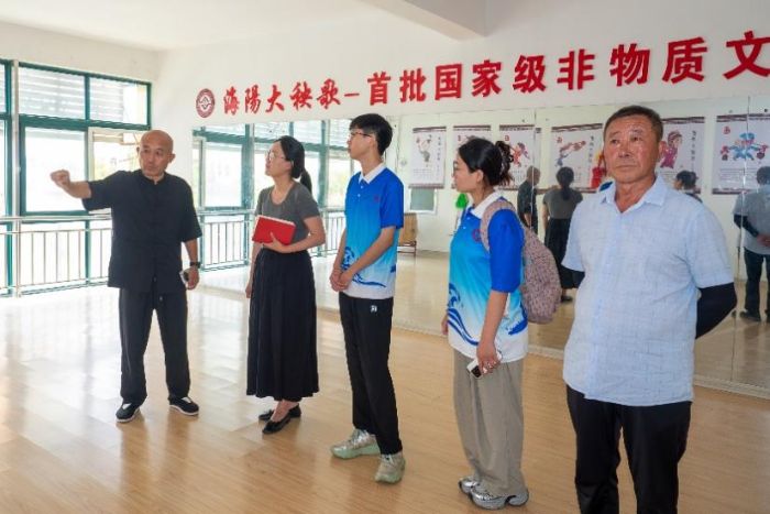 圖為實(shí)踐團(tuán)成員走進(jìn)環(huán)宇秧歌藝術(shù)團(tuán),團(tuán)長(zhǎng)刁永清熱情地為成員們講解海陽(yáng)大秧歌的發(fā)展歷史,他和他的秧歌團(tuán)多年來(lái)一直致力于海陽(yáng)大秧歌的傳承與發(fā)展,積極開(kāi)展秧歌傳承授徒活動(dòng),培養(yǎng)了大批優(yōu)秀徒弟。 張博斌 供圖