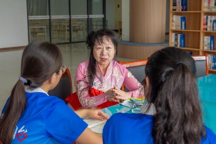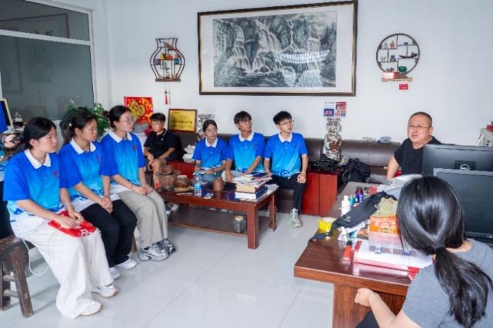 圖為海陽(yáng)市民俗專家李世寧和實(shí)踐團(tuán)成員一起討論非遺文化的未來(lái)發(fā)展情況,他告訴成員們非遺傳承之路任重而道遠(yuǎn),需要一代代人的共同努力。 張博斌 供圖