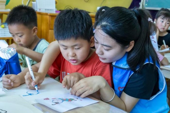 圖為實(shí)踐團(tuán)成員通過(guò)教小朋友畫秧歌卡通人物的方式來(lái)傳播秧歌文化,讓秧歌文化通過(guò)其他方式展現(xiàn)出更多生命力 張博斌 供圖