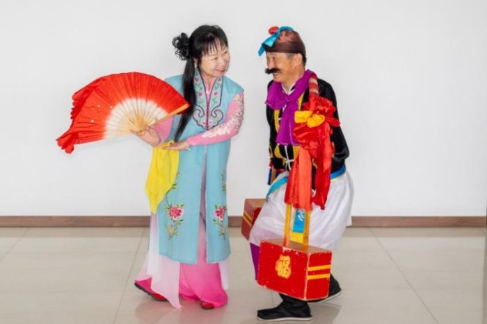 圖為實(shí)踐團(tuán)成員為66歲的姜洪力和63歲的樓玉蓉拍攝的定妝照,夫妻二人同臺(tái)多年,致力于海陽(yáng)大秧歌的發(fā)揚(yáng)傳承,是秧歌界的一對(duì)傳奇。 張博斌 供圖