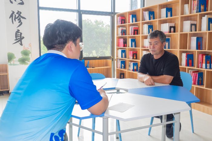 圖為實(shí)踐團(tuán)成員潘康尋訪秧歌傳承人王明濤。