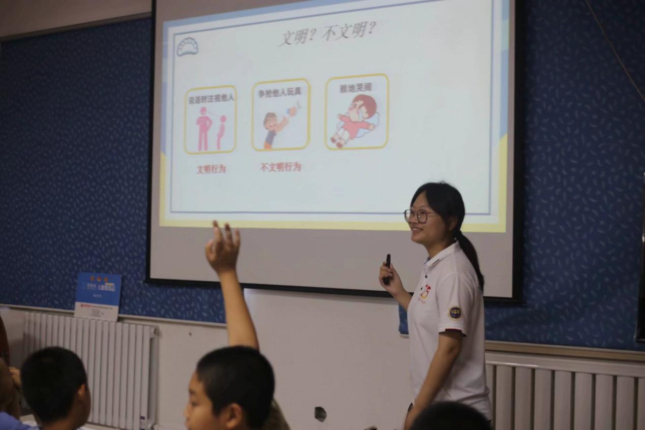 團(tuán)隊(duì)成員先通過小視頻的形式,講述了中國自古以來就是文明禮儀之邦,具有悠久的歷史文化傳統(tǒng)。生動有趣的小視頻吸引了小朋友們的興趣,引導(dǎo)小朋友們開始思考自己生活中是否遵守了文明規(guī)范。團(tuán)隊(duì)成員與小朋友們積極互動,以問答的方式列舉了生活中的種種不文明現(xiàn)象。現(xiàn)場小朋友積極配合,踴躍發(fā)言。