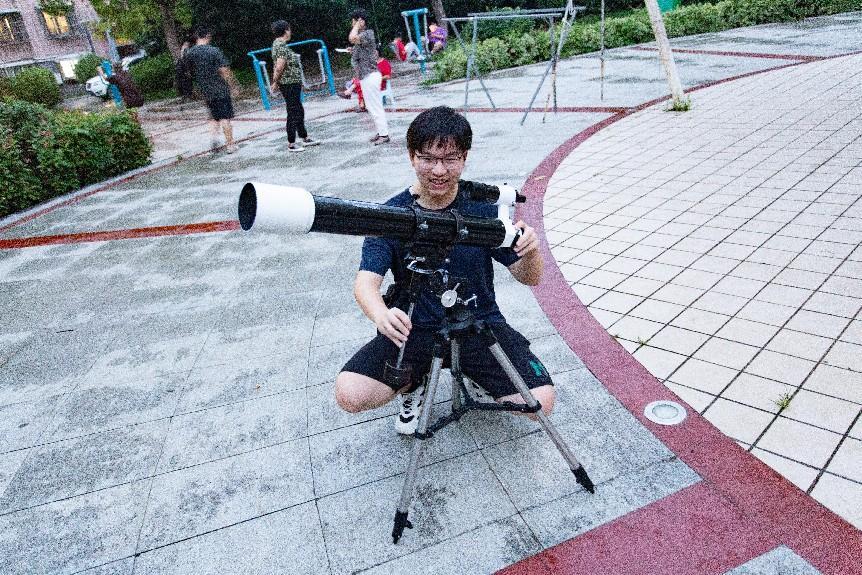 傍晚七點,實踐團抵達了宏泰世紀城廣場,幾個成員開始進行天文望遠鏡的組裝。實踐團成員如同匠人般充滿了儀式感。他們小心翼翼地從袋中取出精密的部件,調整三腳架、對接主體、安裝配件、調節(jié)平衡,每一步都認真細致、一絲不茍。圍觀的大人、小孩越來越多,都對這精妙的儀器產生了興趣。