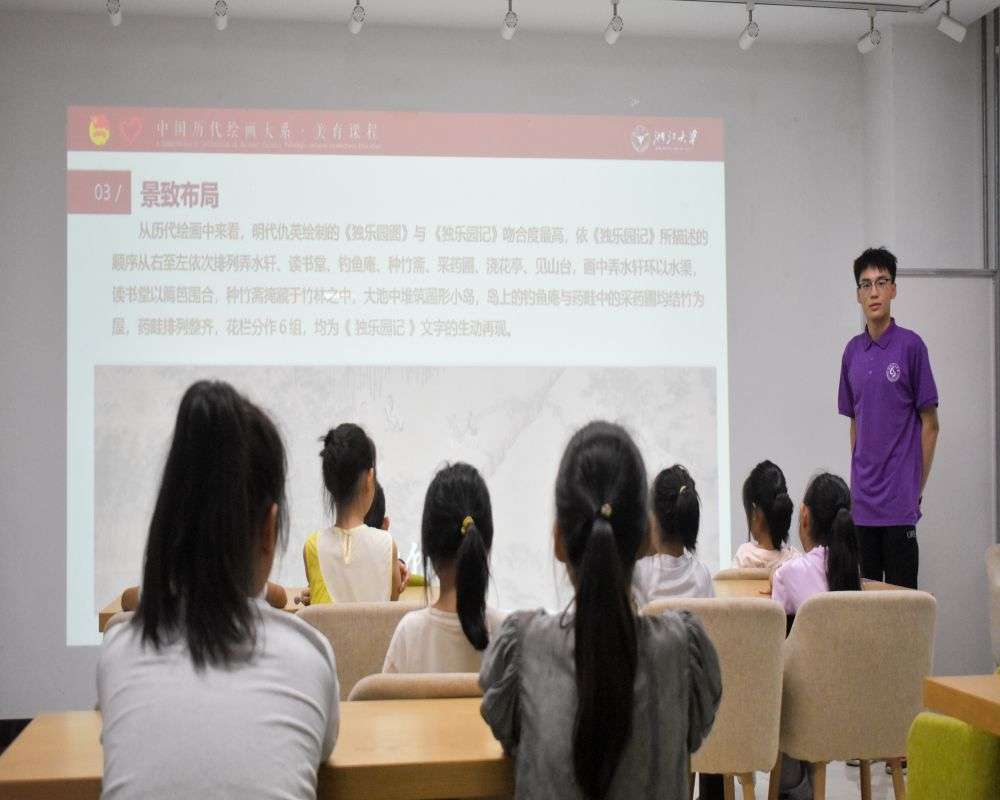 活動伊始,“繪心繪意”志愿宣講團隊長趙慕容同學作為主講,他以深厚的知識功底和生動的講解方式,帶領大家走進中國園林藝術的奇妙世界。他首先講解并梳理了中國園林的歷史脈絡,從先秦時期的宮苑到明清時期的私家園林,每一座園林都承載著時代的印記與文化的精髓。隨后,通過與孩子們的互動,趙慕容同學詳細闡釋了園林與園林繪畫之間的密切聯(lián)系。他表示,園林不僅是人們居住休憩的場所,更是文人墨客寄情山水、抒發(fā)情感的精神家園。而園林繪畫,則是對這一精神家園的藝術再現(xiàn),它以其獨特的審美視角和表現(xiàn)手法,將園林之美凝固于紙墨之間。