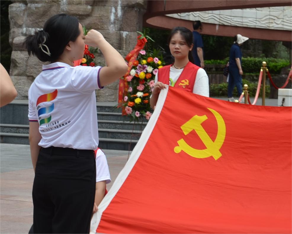 英魂永駐,肅獻(xiàn)哀思。全體成員默哀,繞紀(jì)念碑一周獻(xiàn)上親手所做的白花。在莊嚴(yán)的烈士紀(jì)念碑前,全體黨員面向黨旗,由吳倩老師領(lǐng)誓,帶領(lǐng)大家重溫入黨誓詞。他們誓言將不忘初心,牢記使命,以實(shí)際行動(dòng)踐行黨的宗旨,為黨和人民的事業(yè)奮斗終身。