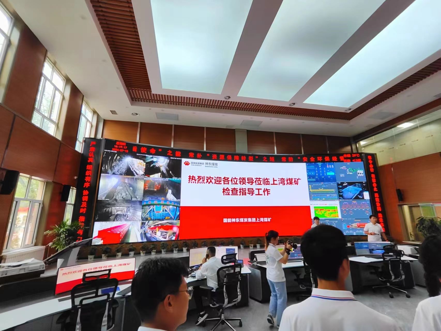 踏入上灣煤礦調(diào)度指揮中心,一股現(xiàn)代化、科技化的氣息撲面而來(lái)。寬敞明亮的大廳內(nèi),巨大的電子顯示屏上實(shí)時(shí)呈現(xiàn)著井下各個(gè)作業(yè)面的情況,工作人員們正專注而有序地忙碌著。