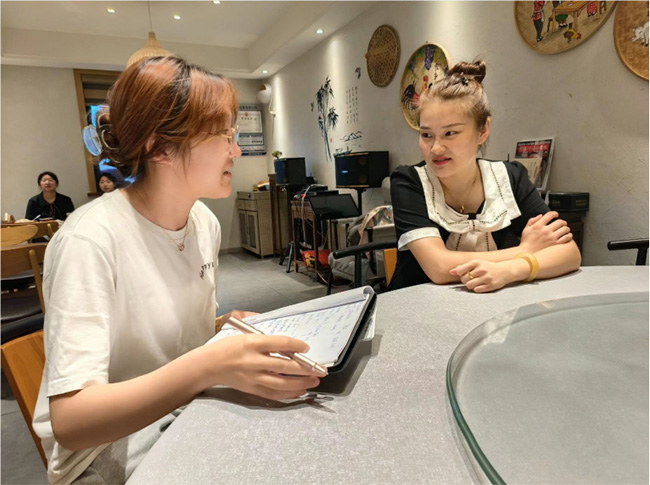 團(tuán)隊(duì)成員采訪到夢界·茶集公司溧陽區(qū)的負(fù)責(zé)人,了解到店鋪開在桂林村的原因:既是因?yàn)楫?dāng)?shù)氐奶厣枞~,也是看中當(dāng)?shù)芈糜螛I(yè)的發(fā)展?jié)摿Α5陜?nèi)最有特色的流觴曲水桌,增添趣味的同時更是為了宣傳中國傳統(tǒng)文化。游客可以當(dāng)場體驗(yàn)宋朝的點(diǎn)茶文化,親手制作古代的茶果子。團(tuán)隊(duì)成員還了解到,店內(nèi)接待過外國交流團(tuán),而國外來訪者們在店內(nèi)親手體驗(yàn)宋朝茶百戲的視頻被我國外交部副部長華春瑩在Twitter平臺轉(zhuǎn)載,收獲了很大關(guān)注,助力中國傳統(tǒng)文化向世界宣傳。