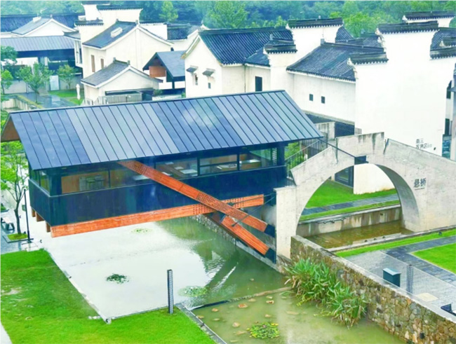 “賦能”美麗經(jīng)濟(jì),商旅融合發(fā)展  為擴(kuò)大當(dāng)?shù)芈糜螛I(yè)發(fā)展優(yōu)勢,桂林村引得涵田度假村旅游綜合體、中國再生醫(yī)學(xué)健康管理中心、東野酒店等眾多重大旅游項(xiàng)目接連落地。同時,桂林村與方所開展合作,在村落周邊區(qū)域打造方所文化村。團(tuán)隊(duì)成員先后走訪了大溪水庫、平橋石壩和方所文化村。水庫平靜而廣闊;平橋石壩造型奇特,瀑布湍急直下;文化村設(shè)計(jì)精巧,保留青山黛瓦的同時建造一片現(xiàn)代化風(fēng)格建筑。暖調(diào)木質(zhì)的旋轉(zhuǎn)書塔、藝術(shù)展廳、黑膠音樂酒吧、非遺手作小館……各種店鋪風(fēng)格統(tǒng)一又富含特色,帶給游客新奇豐富的體驗(yàn)。
