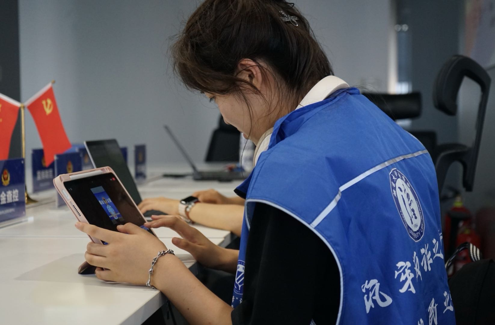 (圖為實(shí)踐隊(duì)成員在預(yù)警勸阻崗位登記信息 “法盾防詐”實(shí)踐隊(duì) 韓昊宇 供圖)