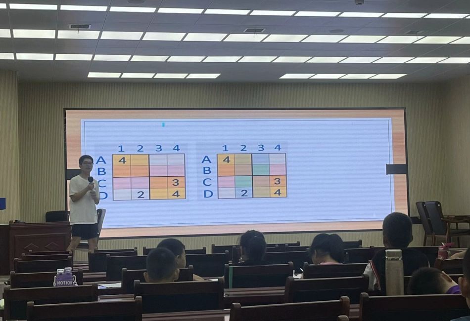 接著,姜俁樂(lè)從數(shù)獨(dú)的兩大思維(內(nèi)功心法)和兩大思路(武功套路),對(duì)數(shù)獨(dú)的思維基礎(chǔ)展開敘述。在講解過(guò)程中,學(xué)生們認(rèn)真聽講,積極參與互動(dòng),時(shí)不時(shí)還會(huì)提出一些問(wèn)題。通過(guò)姜俁樂(lè)的詳細(xì)敘述,學(xué)生們不僅了解了數(shù)獨(dú)的兩大思維和兩大思路,還對(duì)接下來(lái)課程的學(xué)習(xí)充滿好奇。整個(gè)課堂氣氛活躍,學(xué)生們對(duì)數(shù)獨(dú)有了更全面的了解,也激發(fā)了他們對(duì)于數(shù)獨(dú)的興趣和熱情。