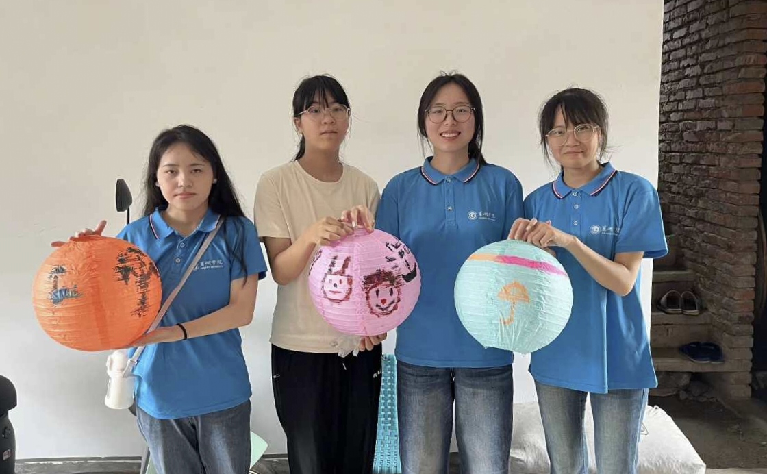 圖為團(tuán)隊(duì)成員與留守兒童展示共同完成的燈籠畫