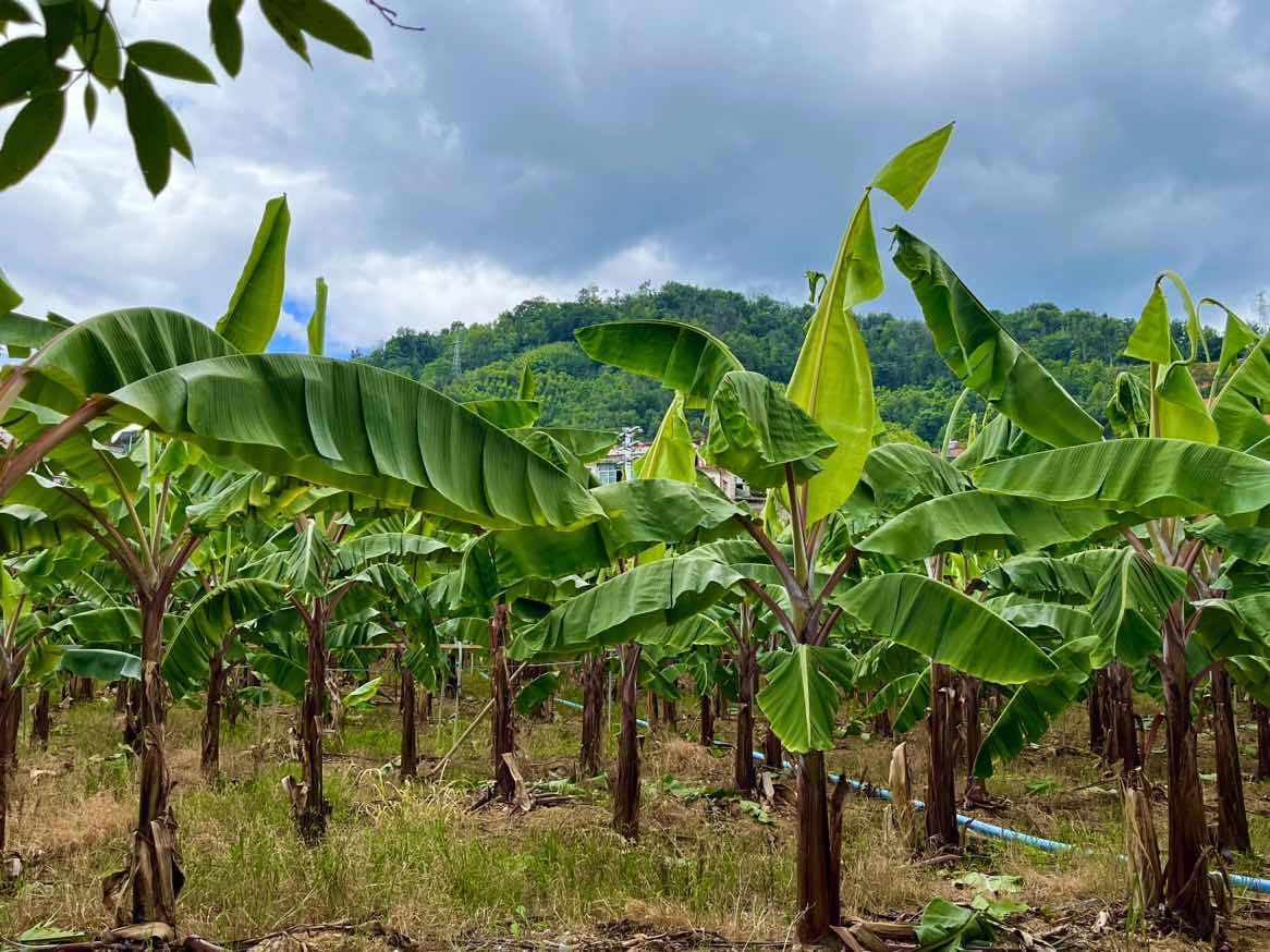 隨后,實(shí)踐團(tuán)隊(duì)步入香蕉種植基地。我們遠(yuǎn)遠(yuǎn)看過去,一叢叢紅皮糯米蕉樹排得很整齊,葉子是翠綠色的,又大又舒展,在微風(fēng)里輕輕晃著。因香蕉樹已經(jīng)經(jīng)過幾輪的采摘,現(xiàn)樹上稀疏掛著紅皮糯米蕉,沒熟的糯米蕉一般是青綠色的,皮很光滑,可能還有一些細(xì)細(xì)的白色粉末或者紋理。等成熟后,顏色更加金黃,還會(huì)發(fā)出誘人的亮光。