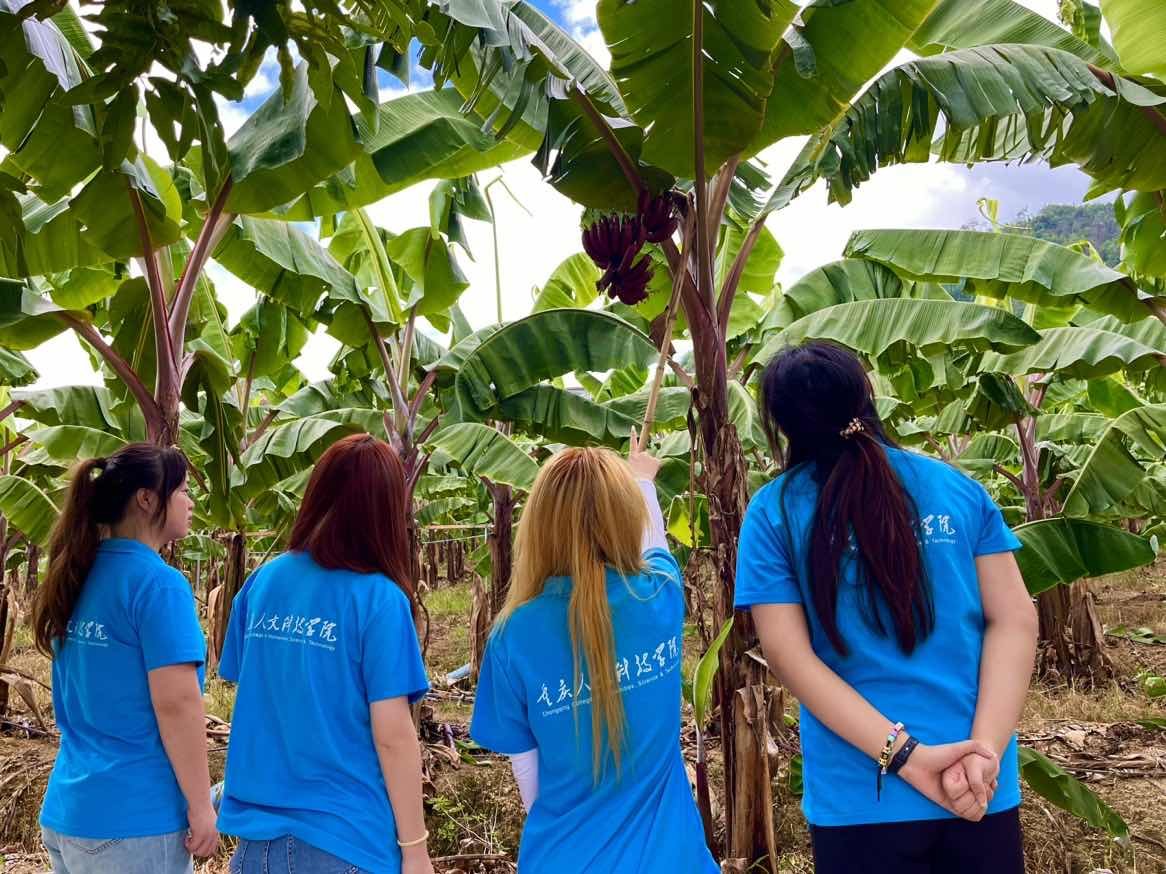 (圖為實(shí)踐團(tuán)隊(duì)成員觀賞紅皮香蕉樹,曹彬攝)