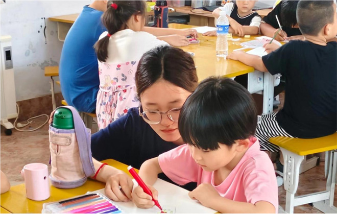此外,支教團(tuán)隊(duì)還組織了“畫(huà)筆繪農(nóng)情”農(nóng)業(yè)主題繪畫(huà)活動(dòng)。活動(dòng)現(xiàn)場(chǎng),在老師們的帶領(lǐng)下,孩子們用手中的畫(huà)筆,描繪出了金黃的麥田、碩果累累的果園、勤勞耕種的農(nóng)民等充滿(mǎn)鄉(xiāng)村氣息的畫(huà)面。每一幅作品都充滿(mǎn)了童真和對(duì)農(nóng)業(yè)的獨(dú)特理解,展現(xiàn)了孩子們內(nèi)心深處對(duì)土地的熱愛(ài)和對(duì)大自然的敬畏。支教老師們不僅耐心地傳授繪畫(huà)技巧,還向孩子們講解了畫(huà)作中所涉及的農(nóng)業(yè)知識(shí),讓孩子們?cè)谒囆g(shù)創(chuàng)作的同時(shí),加深了對(duì)農(nóng)業(yè)生產(chǎn)的認(rèn)識(shí)。此次農(nóng)業(yè)主題繪畫(huà)活動(dòng),不僅培養(yǎng)了孩子們的藝術(shù)素養(yǎng)和創(chuàng)造力,更重要的是,讓他們?cè)跐撘颇懈惺艿搅宿r(nóng)業(yè)的魅力和重要性。