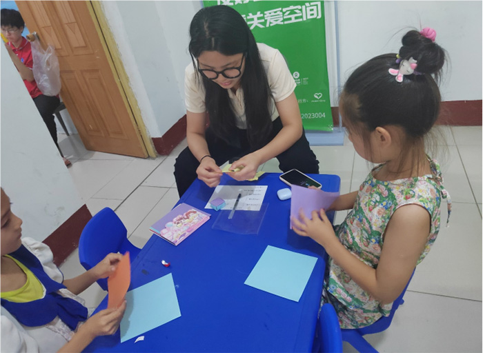 然后,志愿者高祺教給孩子們折紙。折紙可以培養(yǎng)孩子們手,眼,腦的協(xié)調(diào)配合能力。孩子們目不轉(zhuǎn)睛地看著高老師的手法,然后一遍遍地練,功夫不負(fù)有心人。不一會(huì)兒,孩子們就可以折出一些簡(jiǎn)單的小東西了。孩子們看到自己的作品后,都非常地開(kāi)心,收獲了慢慢的成就感。
