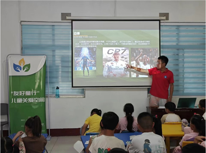 請(qǐng)不要相信,勝利就像山坡上的蒲公英一樣唾手可得,但是請(qǐng)相信,世上總有一些美好值得我們?nèi)σ愿埃呐路凵硭楣牵∵@句經(jīng)典名句正是出自足球詩(shī)人賀煒之口。足球,不僅讓我們強(qiáng)身健體,更給予我們精神上的鼓舞。第二節(jié)課,志愿者呂新一給孩子們帶來(lái)了一節(jié)足球知識(shí)課。呂老師先給孩子們介紹了一些足球的基本規(guī)則。包括足球場(chǎng)的大小,一場(chǎng)足球比賽的時(shí)間等等。接著,呂老師又詳細(xì)地給孩子們介紹了足球場(chǎng)上的位置劃分,呂老師告訴孩子們足球是十一個(gè)人的運(yùn)動(dòng),只有大家團(tuán)結(jié)一致,才能取得最后的勝利。最后,呂老師給孩子們放了一些足球比賽的超燃視頻,孩子們紛紛被球員們精湛的技術(shù)所吸引。通過(guò)這節(jié)課,讓孩子們進(jìn)一步了解足球,中國(guó)足球的未來(lái)在青訓(xùn),希望有越來(lái)越多的孩子喜歡上足球。