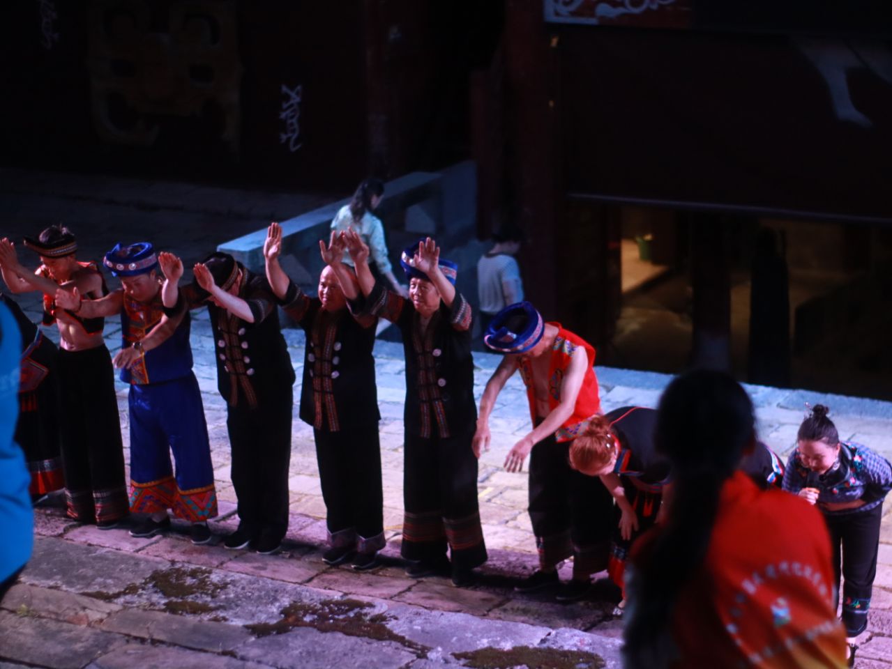 我們在當(dāng)?shù)刈咴L調(diào)查到了酉陽龔灘古鎮(zhèn)的知名傳承人——序風(fēng)小院田老師,他向我們介紹了當(dāng)?shù)氐囊恍┲姆沁z傳承文化如陽戲,木葉等著名的非遺文化。同時他向我們表達了“講好文化故事,傳承非遺文化”的傳承觀念,并介紹了目前非遺文化傳承中遇到的困境與阻礙,希望我們能夠通過此次三下鄉(xiāng)的體驗來幫助他們更好的傳承非遺文化。(圖為實踐團成員與田老師討論)石山攝 采訪非遺文化傳承人對于非遺文化的看法當(dāng)?shù)貫闅g迎大學(xué)生實踐團的到來,為我們表演了一場土家族的非遺文化表演,其中不乏木葉演奏,陽戲,上刀山等傳統(tǒng)精彩表演。在表演過后我們采訪了非遺文化中的上刀山和木葉演奏的非遺傳承者,他們向我們介紹了如何演奏木葉,和上刀山過程中的一些難度,并表達了希望這些非遺文化能夠有更多的年輕人來傳承下去。(圖為木葉老師為實踐團成員演奏)夏欣宇 攝調(diào)查走訪當(dāng)?shù)赜慰蛯τ诜沁z文化傳承的觀點