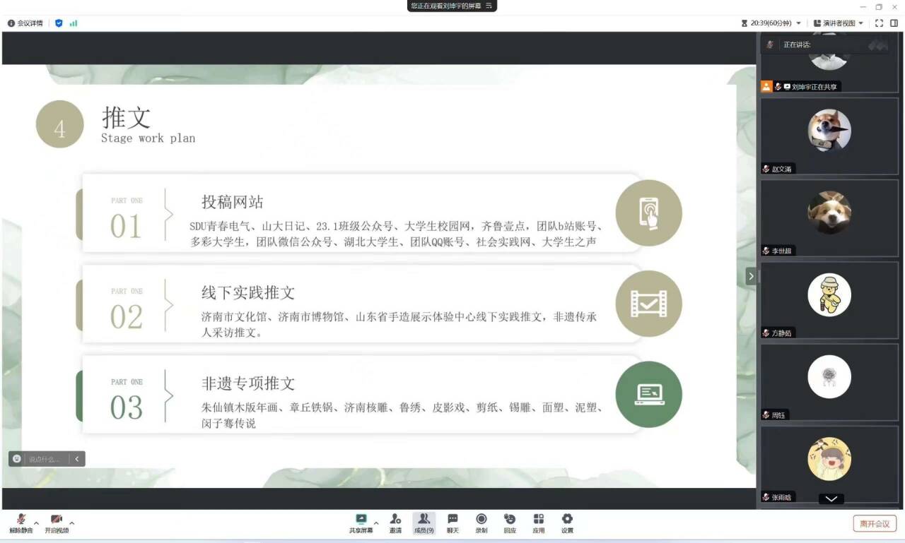 本次中期會(huì)議由團(tuán)隊(duì)負(fù)責(zé)人劉坤宇主持,社會(huì)實(shí)踐團(tuán)隊(duì)全體成員參與。本次活動(dòng)首先對(duì)前期實(shí)踐活動(dòng)進(jìn)行總結(jié),社會(huì)實(shí)踐隊(duì)前往了濟(jì)南市文化館對(duì)非物質(zhì)文化遺產(chǎn)進(jìn)行調(diào)研,并采訪了濟(jì)南市文化館非物質(zhì)文化遺產(chǎn)保護(hù)中心主任,對(duì)非物質(zhì)文化遺產(chǎn)的宣傳保護(hù)有了更為深入的了解,團(tuán)隊(duì)獲得濟(jì)南市文化館的高度認(rèn)可。此外,團(tuán)隊(duì)還前往濟(jì)南市博物館、山東省手造展示中心進(jìn)行調(diào)研,深入了解濟(jì)南市代表性非物質(zhì)文化遺產(chǎn),形成非遺專項(xiàng)系列推文及實(shí)踐推文,推動(dòng)濟(jì)南市非物質(zhì)文化遺產(chǎn)的宣傳。