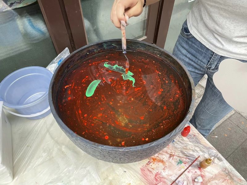 圖為實(shí)踐隊(duì)隊(duì)員在王老師的指導(dǎo)下體驗(yàn)漆扇制作。 張佳怡供圖