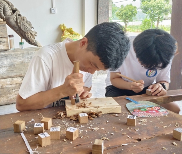 在陽(yáng)光灑滿大地,微風(fēng)吹拂湖面的清晨,“拾遺”志愿服務(wù)隊(duì)駐咸寧分隊(duì)全員先是前往成希創(chuàng)新工作室繼續(xù)學(xué)習(xí)通山木雕的基本雕刻技法。因結(jié)業(yè)在即且工作室的兩位指導(dǎo)老師當(dāng)前有其他事情需要忙碌,故實(shí)踐隊(duì)成員需承擔(dān)獨(dú)立雕刻印章的重要任務(wù),同時(shí)這也是檢驗(yàn)實(shí)踐隊(duì)成員近段學(xué)習(xí)成果的重要契機(jī)。