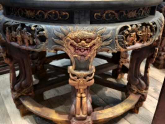 其中通山木雕技法下的木獅圓桌讓實(shí)踐隊(duì)尤為驚嘆,其整體為四根微拱圓弧的柱子支撐起一塊圓形木桌,圓桌整體分為兩層且兩層相隔的中間均雕刻著纏繞的花紋,其中每根柱子與圓桌相接的地方雕刻著一只栩栩如生、威嚴(yán)高貴的獅頭,尤其是獅頭的眼睛及其傳神,雖然雕刻技法看似淺顯卻引得實(shí)踐隊(duì)頻頻回目認(rèn)真觀摩,展開(kāi)一次來(lái)自精神的共鳴,穿越歷史的交流。獅頭相間的中間各自雕刻者不同的四幅神態(tài)各異、人物各異的浮雕,不得不讓實(shí)踐隊(duì)感慨雕刻者經(jīng)驗(yàn)之豐富,技法之成熟,這也讓實(shí)踐隊(duì)成員更加堅(jiān)定要學(xué)好并傳承好悠久神秘的木雕技巧,讓其流芳百世,傳承千古。