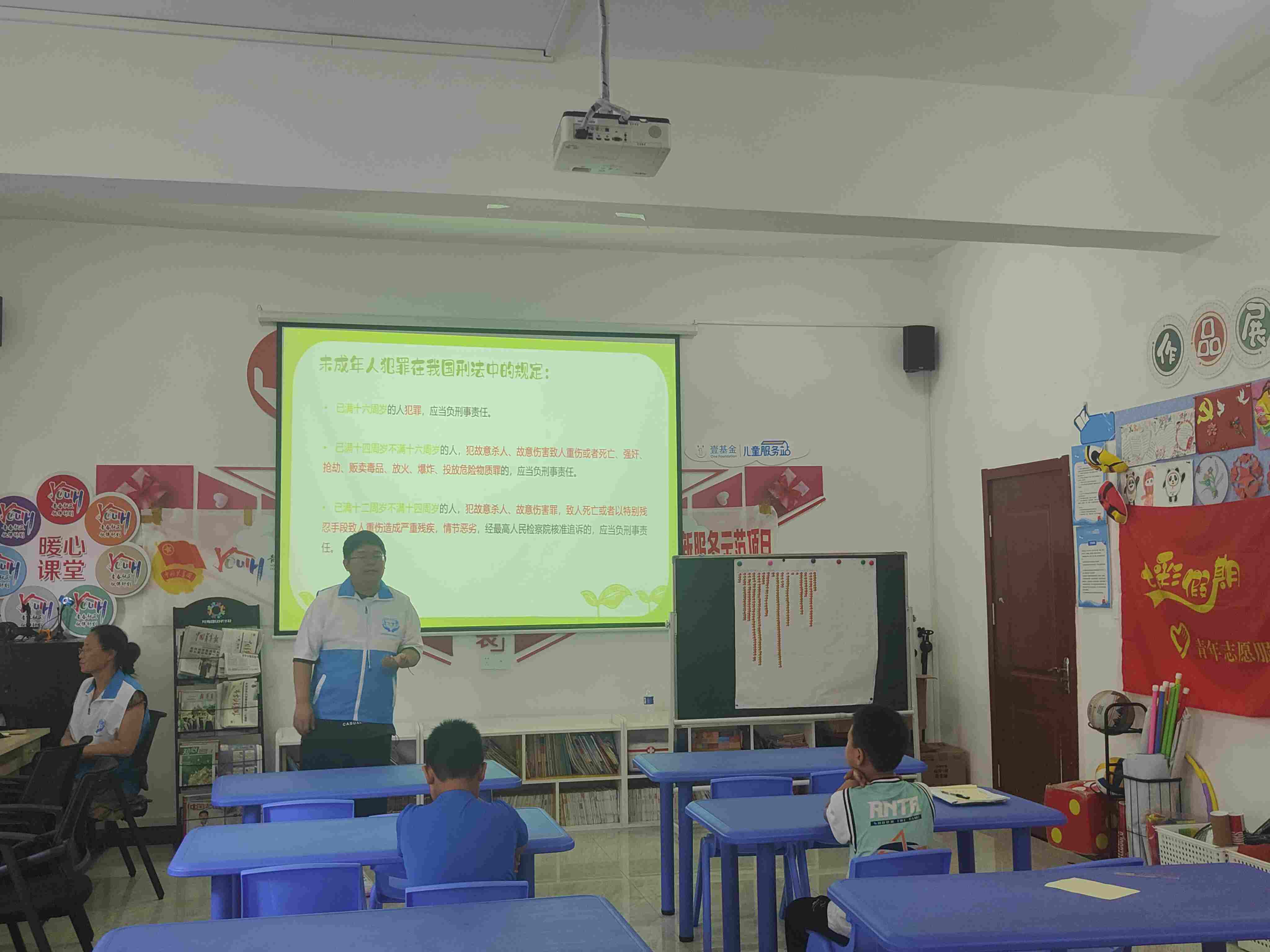 下午,“我們的法律”課堂則帶領小朋友們進入了一個全新的學習世界。通過觀看法律動畫片,小朋友們初步了解了有關的法律知識。志愿者們通過播放PPT,以“提問-搶答”的方式與小朋友們互動,并鼓勵他們在平時的學習生活中去探索法律。