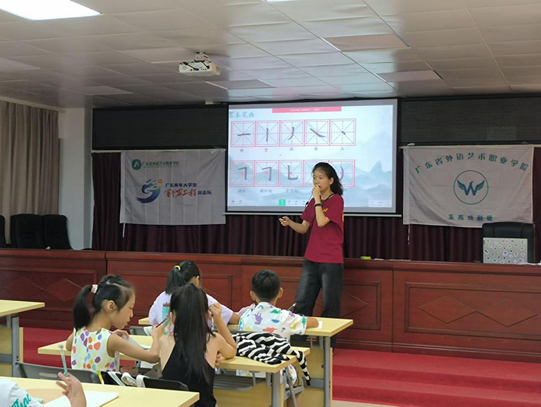 為切實推進“百千萬工程”,發(fā)揮高校人才優(yōu)勢助力鄉(xiāng)村振興,廣東省外語藝術(shù)職業(yè)學(xué)院基礎(chǔ)教育學(xué)院五燕戲劇團支教隊于2024年7月11日至7月19日,采用線下的方式,在陽春市青少年綜合服務(wù)中心進行授課,共開展為期7天的暑期社會實踐活動。本次實踐活動以 “傳統(tǒng)文化與雙語戲劇”為主題,并開展了一系列相關(guān)課程。隨著科技的飛速發(fā)展,現(xiàn)代技術(shù)已經(jīng)滲透到我們生活的方方面面。現(xiàn)代技術(shù)的應(yīng)用正為傳統(tǒng)文化注入新的活力。在硬件設(shè)施不足的情況下,五燕戲劇團支教隊隊員利用現(xiàn)代技術(shù)賦能教學(xué):用AI智能帶學(xué)生了解甲骨文、用希沃軟件讓學(xué)生感受硬筆書寫的魅力。現(xiàn)代技術(shù)賦能教學(xué)課堂,可以吸引學(xué)生的注意力,使他們更積極地參與課堂活動。(通訊員 溫冰雁)