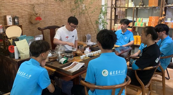 (圖為實踐隊在和雷鳴老師交流和品鑒花茶)