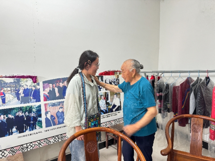 隨后,實踐團前往雙后崗村,對國家級畬族山歌傳承人藍陳啟女士進行深入采訪。藍陳啟女士表示,她曾去過日本、美國、韓國等多個國家唱畬歌,習(xí)近平總書記也來聽過她唱的畬歌。除了向團隊成員展示了畬歌展演時的精美服飾之外,藍陳啟女士還展示了不少活動的珍貴相片,其中包括通過畬歌的形式向畬族民眾宣傳反詐知識、演出慶祝畬族傳統(tǒng)節(jié)日“三月三”等。在采訪過程中,團隊成員更加深刻的感受到了畬語在文化傳承與交流中的重要地位。