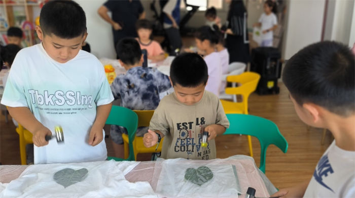 在植物拓染課上,孩子們采集樹葉和花朵,通過捶打的方式將植物的形狀和色彩留在布料上,感受自然與紡織的奇妙結(jié)合。蠟染課程中,志愿者指導孩子們用蠟刀繪制圖案,經(jīng)過染色、去蠟等工序,創(chuàng)作出獨具特色的蠟染作品。