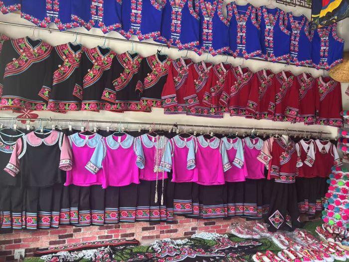 實(shí)踐期間,隊(duì)員以彝人古鎮(zhèn)店鋪工作人員、刺繡傳承人為主要采訪對(duì)象,圍繞彝族服飾的核心要素展開(kāi)調(diào)研。在色彩體系方面,經(jīng)實(shí)地觀察與受訪者介紹確認(rèn),彝族服飾以黑、紅、黃為基礎(chǔ)色調(diào),其中黑色象征對(duì)土地的敬畏,紅色代表生活熱情,黃色寓意豐收希望。調(diào)研中發(fā)現(xiàn),當(dāng)?shù)胤棾R院谏珵榈咨钆浯蠹t色火焰紋與金黃色太陽(yáng)圖案,形成具有強(qiáng)烈視覺(jué)辨識(shí)度的色彩組合。