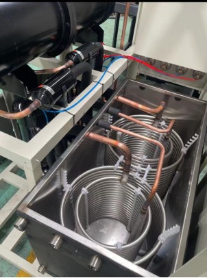 調(diào)研過程中,企業(yè)負(fù)責(zé)人系統(tǒng)介紹了核心設(shè)備的工作原理,并以螺桿式冷水機(jī)組為例,詳細(xì)闡釋其高效散熱機(jī)制:該設(shè)備基于制冷劑“蒸發(fā)吸熱、冷凝放熱”的循環(huán)原理,通過五大核心部件協(xié)同實(shí)現(xiàn)持續(xù)散熱。系統(tǒng)運(yùn)行伊始,壓縮機(jī)將低溫低壓的制冷劑蒸氣壓縮為高溫高壓狀態(tài),為熱量轉(zhuǎn)移提供動(dòng)力;油分離器隨即分離蒸氣中夾帶的潤滑油,保障換熱效率。隨后,高溫高壓蒸氣進(jìn)入冷凝器與冷卻水進(jìn)行熱交換,冷凝為高壓液體并釋放熱量;高壓液體經(jīng)節(jié)流閥降壓,形成低溫低壓氣液混合物并進(jìn)入蒸發(fā)器,吸收冷凍水熱量后完全蒸發(fā),低溫冷凍水即可實(shí)現(xiàn)設(shè)備降溫。最終,制冷劑蒸氣重回壓縮機(jī),開啟下一輪循環(huán),為工業(yè)設(shè)備提供穩(wěn)定可靠的散熱保障。
