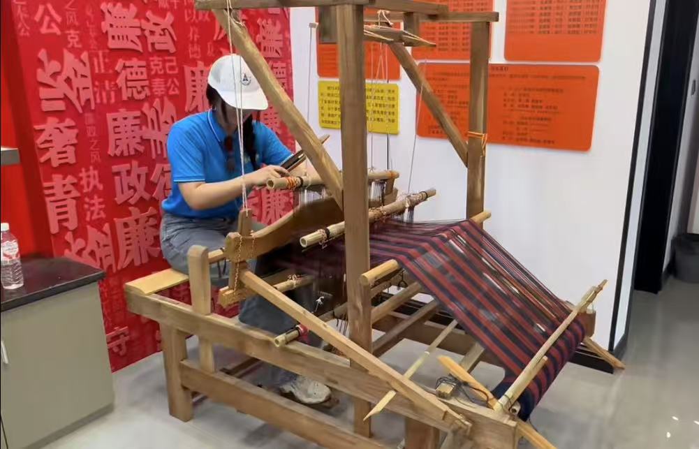 圖為調(diào)研隊員在村史館學習土家族傳統(tǒng)紡織技術(shù) 楊奕睿攝