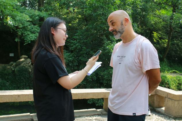 圖為實(shí)踐團(tuán)隊(duì)成員韓韻采訪來自美國(guó)的游客。陳思源供圖。