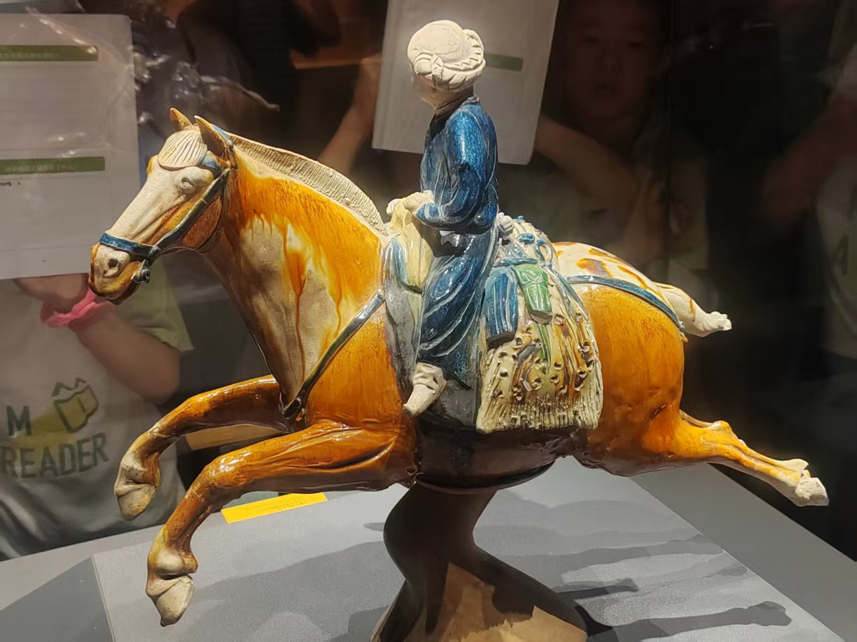 步入展廳,承載著千年時光的文物依次鋪展:唐代彩繪侍女俑發(fā)髻高挽、衣袂翩躚;《客使圖》壁畫上,各國使者神態(tài)各異;而造型獨(dú)特的唐三彩載樂駝俑,更是以駝背上樂手演奏的姿態(tài),生動再現(xiàn)了唐代中外文化交融的場景,瞬間將隊員們帶入十三朝古都的時光長河。大家或掃描展柜二維碼聆聽沉浸式解說,或圍站在公益講解志愿者身旁認(rèn)真學(xué)習(xí),在“聽與思”的互動中,厘清文物背后的時代脈絡(luò),深化對傳統(tǒng)文化的認(rèn)知。