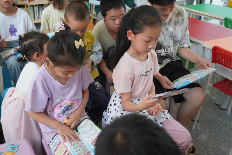 7月15日,重慶市石柱縣中益鄉(xiāng)華溪村,小學(xué)生們?cè)陂喿x重慶外語(yǔ)外事學(xué)院“三下鄉(xiāng)”社會(huì)實(shí)踐團(tuán)分發(fā)的安全知識(shí)宣傳冊(cè)。重慶外語(yǔ)外事學(xué)院西方語(yǔ)學(xué)院/供圖