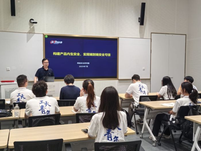 7月8日,實(shí)踐隊(duì)走進(jìn)大華股份,公司招聘經(jīng)理丁迪系統(tǒng)介紹了公司的戰(zhàn)略布局、企業(yè)文化及校招崗位需求,并強(qiáng)調(diào)期待與高校深度合作,共同培養(yǎng)網(wǎng)絡(luò)安全人才。網(wǎng)絡(luò)空間安全首席科學(xué)家張劍青以《構(gòu)建產(chǎn)品內(nèi)生安全,實(shí)現(xiàn)端到端安全可信》為主題,為實(shí)踐隊(duì)員進(jìn)行了前沿技術(shù)分享。