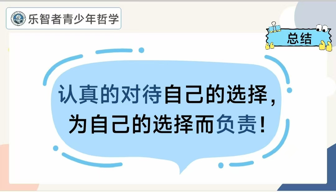在課堂的最后,范老師將同學(xué)們從哲學(xué)思考拉回到日常生活之中,通過一則校園霸凌實(shí)例告訴同學(xué)們,袖手旁觀并不是正確的選擇,只有正視并承擔(dān)自己的責(zé)任才能做出正確的選擇。“認(rèn)真對(duì)待自己的選擇,為自己的選擇而負(fù)責(zé)。