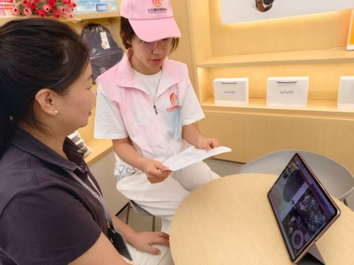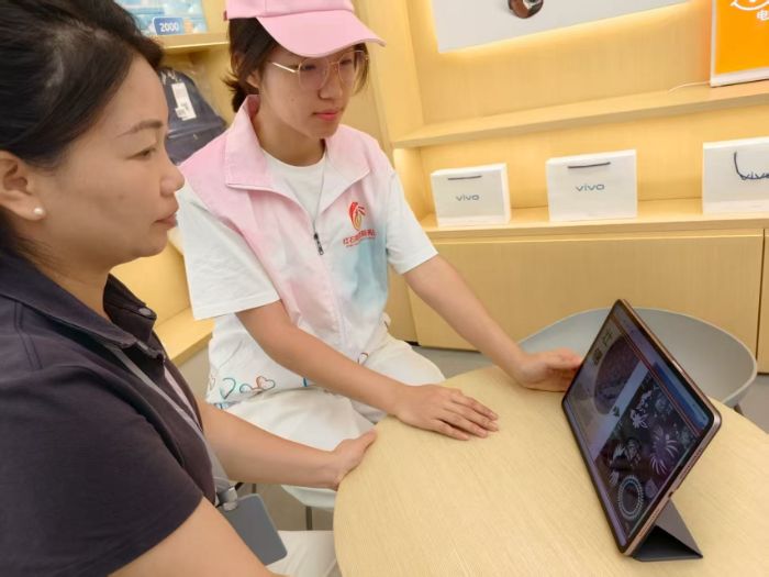 8月27日,志愿隊首先在寶應縣吾悅廣場vivo線下門店開展文化宣傳活動。志愿者們身著統(tǒng)一服裝,借助門店平板設備展示侗族特色圖案,包括侗族刺繡紋樣、鼓樓建筑輪廓等文化符號,向顧客詳細講解圖案背后的文化寓意。例如,侗族刺繡中的花鳥圖案象征著對自然的敬畏,幾何圖形則代表著民族的歷史記憶。此外,志愿者還通過文字資料補充介紹了侗族的傳統(tǒng)節(jié)日,如薩瑪節(jié)的祭祀流程、合攏宴的熱鬧場景,以及侗族大歌的多聲部合唱特色,引導顧客從多角度深入了解侗族文化。