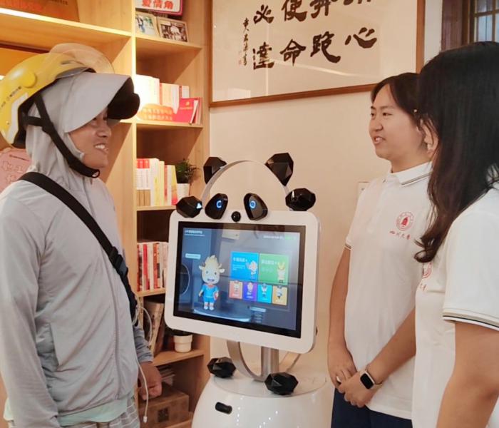 “小牛哥・剎一腳”愛心智慧驛站自2021年在成都市委組織部指導(dǎo)下建立,2022年投入使用,是新就業(yè)群體24小時不打烊的“暖心服務(wù)站”和“溫馨港灣”。目前,四川省成都市錦江區(qū)已建成41個此類驛站,為外賣員、快遞員等提供19項貼心服務(wù)。實踐團成員實地參觀了“小牛哥・剎一腳——宏清站”,這里不僅設(shè)有“愛心冰柜”——在夏季為戶外工作者提供冰鎮(zhèn)飲用水,咖啡機、飲水機、冰箱、空調(diào)、微波爐等設(shè)備一應(yīng)俱全,還有常用藥品、應(yīng)急雨衣等暖心物資;而且,驛站還引入智能機器人,為“小牛哥”提供法律援助、政策咨詢等服務(wù),科技管家實現(xiàn)全天候值守,讓新就業(yè)群體隨時可享服務(wù)。