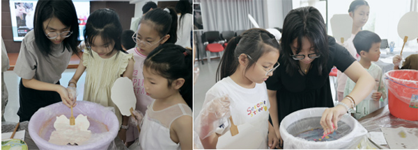 在主講老師邵佳勵(lì)與副講老師花榕檀的指導(dǎo)下,孩子們化身小小漆藝師。挑選心儀色漆滴入水中,凝神觀察色彩流動(dòng)滲透的自然韻律;輕提團(tuán)扇覆于水面,瞬息吸附轉(zhuǎn)印出獨(dú)一無二的紋理。“看!我的扇子像極光!”“我的像海底珊瑚!”創(chuàng)作臺(tái)前驚嘆四起,孩子們興奮分享成果,在流動(dòng)的漆色中深化了對(duì)周三“溝通小宇宙”課程的理解。活動(dòng)全程貫穿協(xié)作精神,社工引導(dǎo)孩子們互借工具、共護(hù)操作環(huán)境,讓千年漆藝課堂成為踐行雙向溝通的生動(dòng)舞臺(tái)。本次漆扇活動(dòng)作為繼“花草燈”非遺實(shí)踐后的第二場(chǎng)非遺體驗(yàn)活動(dòng),持續(xù)以“可觸摸的文化”增強(qiáng)兒童民族認(rèn)同。