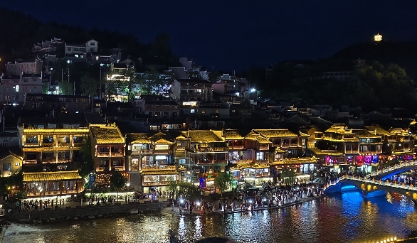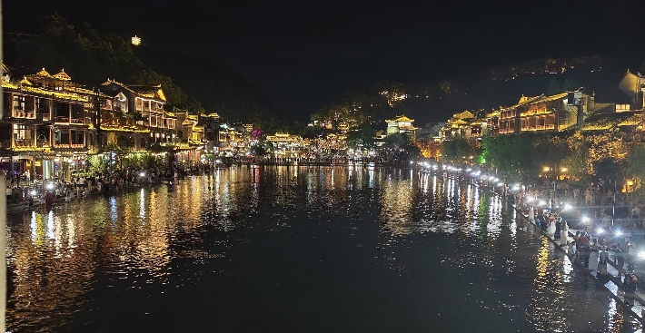 暑假期間,曲阜師范大學(xué)文學(xué)院逐飛實踐隊隊員走進(jìn)了沈從文先生的筆下的故鄉(xiāng)——鳳凰古城。初見是在夜晚,沱江兩岸的小樓在燈光勾勒下錯落有致而金碧輝煌,霓虹與江波相映,明晃晃的金黃與泛著漣漪的藍(lán)交相輝映,游客摩肩接踵,嬉笑聲不斷,一派熱鬧繁榮。