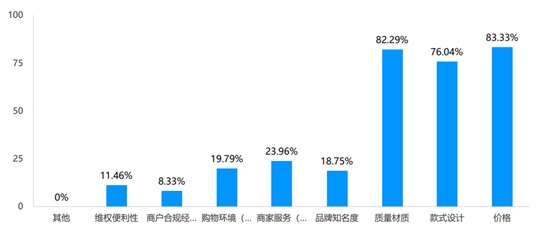 在參觀調(diào)研過(guò)程中,調(diào)研組還向正在逛街的顧客發(fā)放了調(diào)研問(wèn)卷,具體調(diào)查湘派服裝傳統(tǒng)批發(fā)市場(chǎng)消費(fèi)行為與需求。據(jù)調(diào)查問(wèn)卷與實(shí)地采訪顯示,在批發(fā)市場(chǎng)購(gòu)物時(shí),價(jià)格是影響購(gòu)買的最主要因素,83.33%的顧客最關(guān)注價(jià)格;次之是服裝的質(zhì)量材質(zhì)和款式設(shè)計(jì),占比分別達(dá)到82.29%、76.04%,遠(yuǎn)高于18.75%的品牌知名度等因素。由此可見(jiàn),金冠服裝城是靠真誠(chéng)的價(jià)格、質(zhì)量材質(zhì)和款式設(shè)計(jì)深深打動(dòng)了顧客。