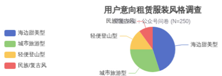 為更準確地把握用戶需求,我們通過公眾號進⾏了⼀次線上問卷調查(有效樣本N=250)。調查結果顯⽰,學⽣對不同風格的旅游服裝有明顯偏好。