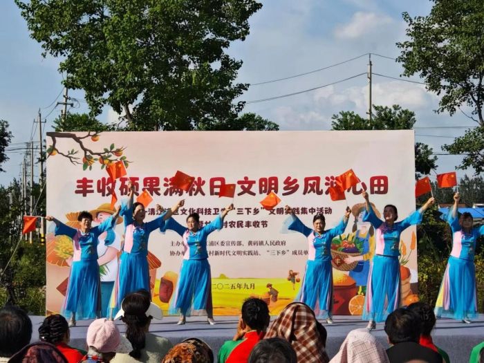 節(jié)目開始前,清江浦區(qū)黃碼鎮(zhèn)人民政府宣傳統(tǒng)戰(zhàn)委員張昕琦發(fā)表了致辭,拉開了此次音樂節(jié)活動的序幕。緊接著音樂節(jié)在華飛藝術團恢宏熱烈的舞蹈《五星紅旗》中啟幕。演員們以飽滿的情緒和鏗鏘的舞步,演繹出對家國的深厚情感,也舞出了農民歡慶豐年的自豪。隨之而來的“夾花生大賽”“袋鼠跳一跳”等農趣游戲,巧妙將農耕勞動轉化為趣味互動,使觀眾在參與中重溫勞動之美,感受豐收之樂。