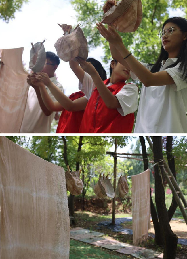在茶禮茶俗的浸潤下,志愿者們開始體驗藝術(shù)茶染。對于這個古老又獨特的技藝,志愿者們抱著學習的心態(tài)慢慢嘗試、一起研究。茶葉中的茶多酚可以與棉、麻類織物的纖維素纖維結(jié)合,不同品種的茶葉所染出的顏色、色澤也各有不同。